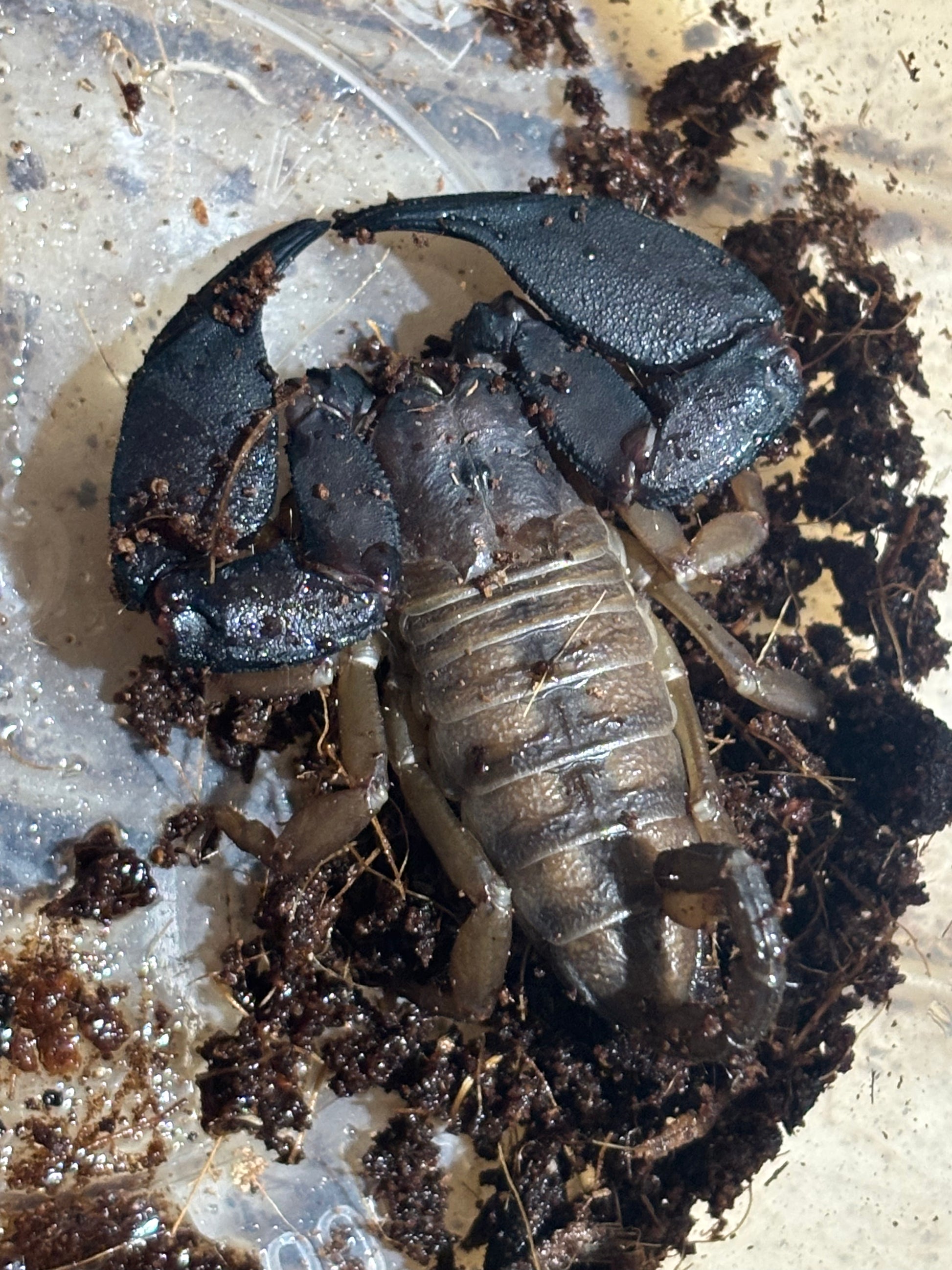 Upon arrival the mature female rainforest scorpion appeared well fed and was decently active in her behaviour, she went into main burrow shortly after she was put into her enclosure